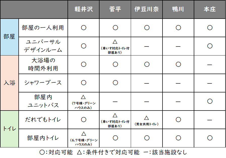 各セミナーハウスの個室・トイレ・風呂の配慮対応