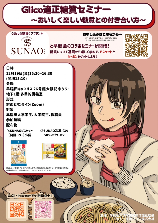 この度、学生健康増進互助会(早健会)主催の新イベント「Glico適正糖質セミナー」〜正しく楽しい糖質との付き合い方〜を開催します!