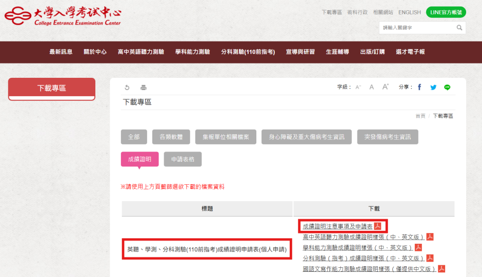 ※請選擇「學測成績證明申請表(個人申請)」-「成績證明注意事項及申請表」