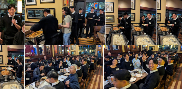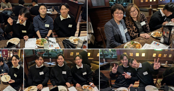 夕食会は、前サンフランシスコ稲門会会長のディアース治子氏と、校友の福山龍氏による心温まる歓迎の挨拶で幕を開けました。続いて、同じく校友で、プロ野球選手としてかつて日本とアメリカ(ニューヨーク・メッツ)両国でプレーした小宮山監督がスピーチし、出席者一同、心を引き込まれていました。さらに、前サンフランシスコ稲門会会長の西村孝が、野球部がスタンフォード大学と最後に対戦したのは、なんと121年も前でした!というエピソードを紹介し、会場を沸かせました。その後、西村氏が音頭を取って乾杯を行い、野球部関係者は、サンフランシスコ稲門会やLA稲門会の会員、慶応義塾大学同窓会の会員、早稲田フレンズ、そして特別ゲストである在サンフランシスコ日本国総領事館の大槻耕太郎総領事とともに着席し、アメリカン・スタイルの夕食が始まりました。
