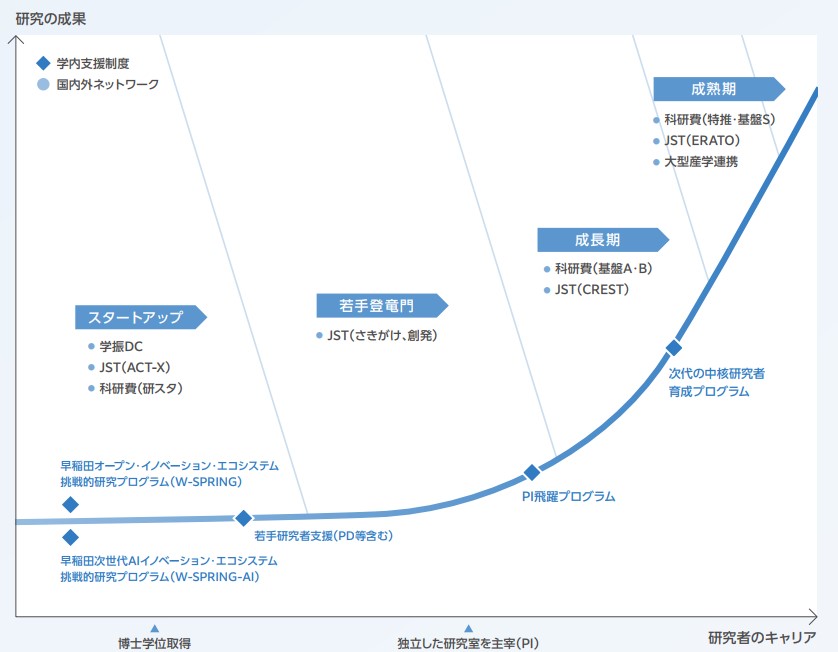早稲田大学では、研究者の各キャリアステージに対して最適な支援策を実施することを目指し、戦略的に制度設計をしています。
