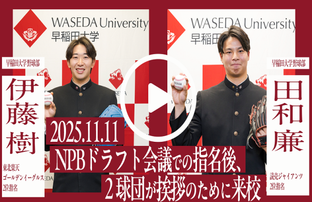 プロ野球ドラフト会議で指名された伊藤投手(スポ4年)、田和投手(教育4年)が両球団から指名挨拶。当日の様子をお届けします。