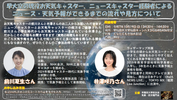 ニュースキャスターとお天気キャスターの両方をご経験された前川さんと、学生時代からお天気キャスターをされている井澤さんだからこそのお話もお聞きできます(質問の時間もあります)。