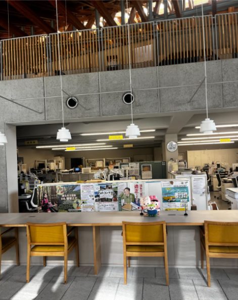 私自身、実習で訪問するまでは丹波山村に対して「人がいない」「寂れた場所が多い」「問題を多く抱えた地方」というマイナスな印象をたくさん持っていました。ところが、一回目の実習で現地を訪れた際に、新庁舎の先進的なデザインや温かみのある空間に触れ、丹波山村に抱いていたイメージは大きく変わりました。その外観や素敵な団らんの場を見ると、「こんな役場がうちの地元にもあればいいのに」と羨ましく思うほどでした。