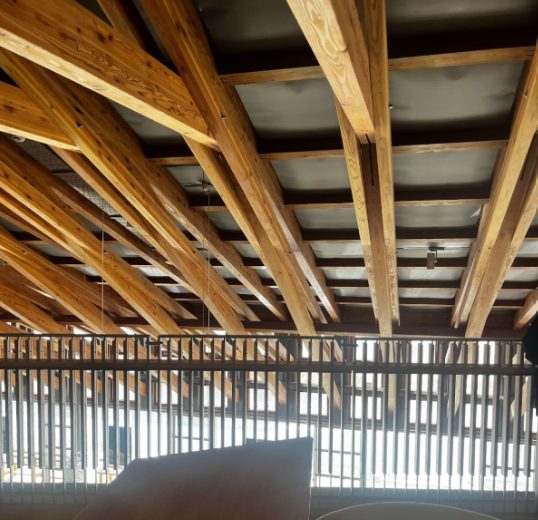また、二階の天井はやや低めに設計されているため、一階や外部から見るよりも木造×鉄筋コンクリート造の壮麗な設計構造が見えやすくなっています。新庁舎はその構造のほとんどがむき出しになっているため、どこから見ても美しいように木材同士の組み合わさっている部分や異素材の接合部分など細かな箇所が丁寧に設計・施工されているそうです。新庁舎を訪れた際はぜひチェックしてみてください!