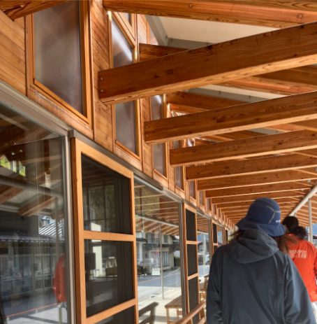 この新庁舎の設計には9つの会社による公募型コンペを経て選ばれたデザインが採用されました。設計で力を入れたポイントの一つは木材の使い方。入口側の軒下を歩くと、たくさんの木材が巧みに組まれている様子を見ることができます。この新庁舎はバス停の発着点にもなっているので、軒下はバスの待合スペースとしても利用されるそうです。