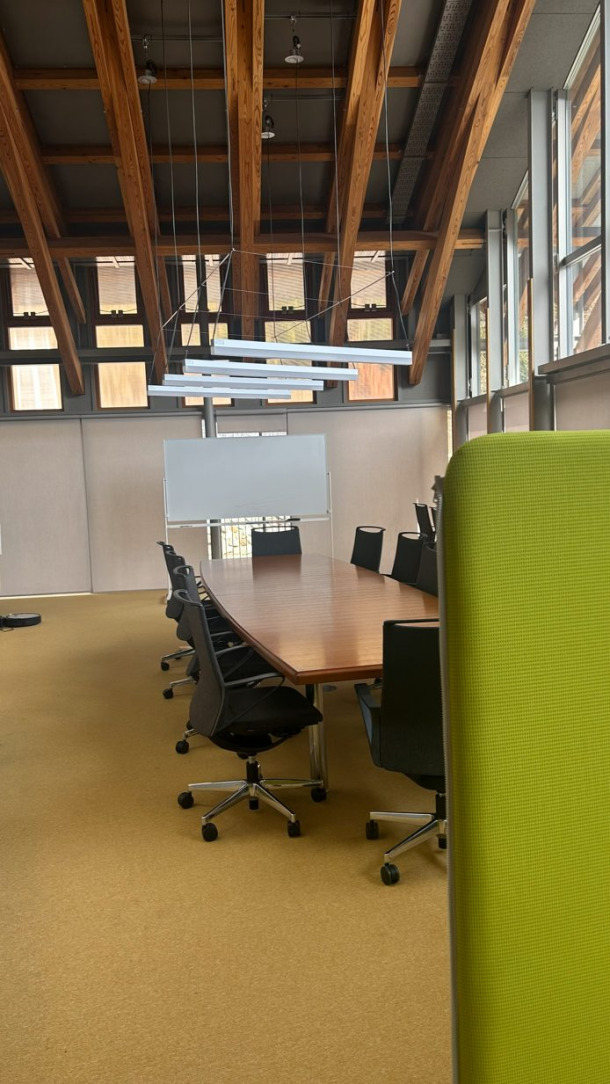 二階に上がってすぐに広々とした「大会議室」が登場。この大会議室、実は6名の村の議員さんたちが議場として使用することもあるそうです。他の市区町村では議会を開催する議場と役場を別々に建設することが多いですが、丹波山村ではこうして併設してしまうことでコスト削減や行政機能のコンパクト化も図っているのだとか。私たちが新庁舎を訪れた日には大会議室の仕切りが使用されていましたが、普段誰も使用していない時は仕切りをしまい、開放感のある空間を楽しむことができるようです。
