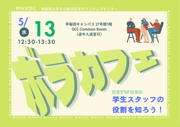5月13日(水)に、学生スタッフに興味のある早大生を対象に、【WAVOC ボランティア・カフェ】を開催します!