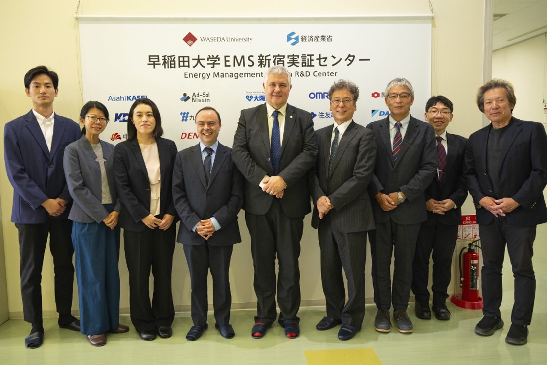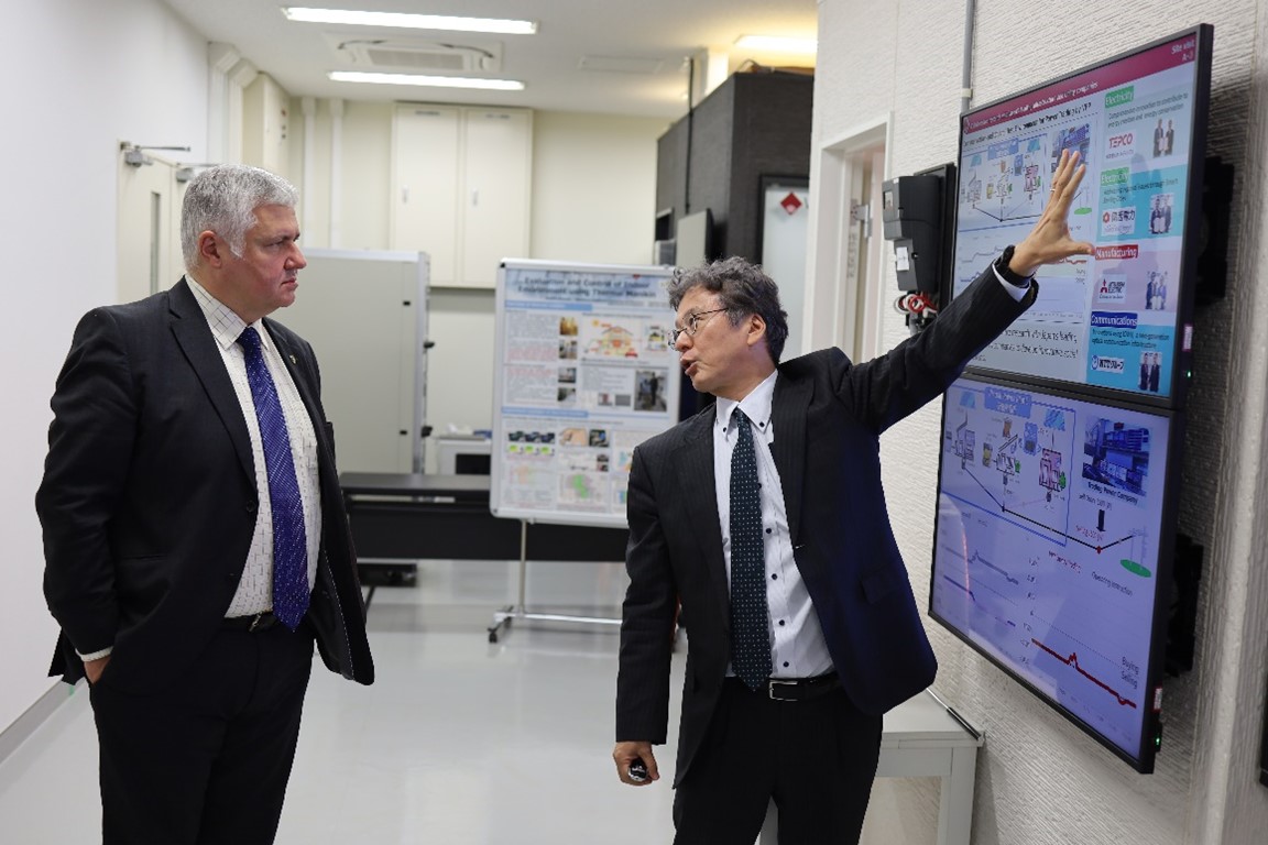 冒頭で弦間理事から歓迎の意が表され、理工学術院長補佐である近藤教授からも冒頭のご挨拶と研究紹介がありました。続いて、天沢准教授による進行のもと、林所長、喜久里准教授よりスマートエネルギーシステム、前原教授より第6世代移動通信システム、森島教授よりAI・ロボティクス、花田准教授よりクリーンエネルギー(水素・アンモニア)に係る研究紹介がそれぞれ行われました。その後、林所長により新宿EMS実証センターのラボツアーが行われました。後半ではClive Roberts教授を交え、本学側教員との意見交換を行い、両者の研究推進や連携の可能性について活発な意見交換が行われました。