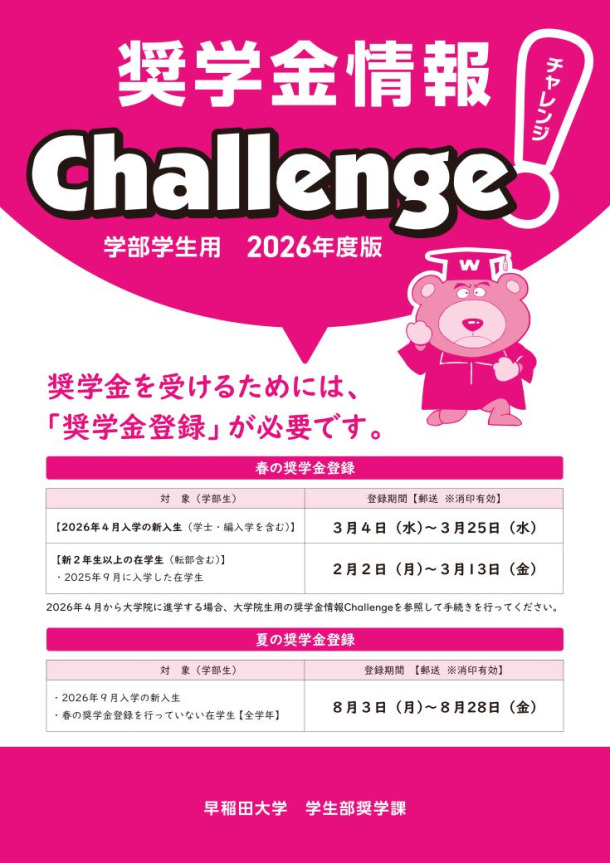 そんな中、奨学金案内冊子『奨学金情報 Challenge』を手にして早稲田大学には返済不要の独自の奨学金が多くあることを知り、再度一括登録をしました