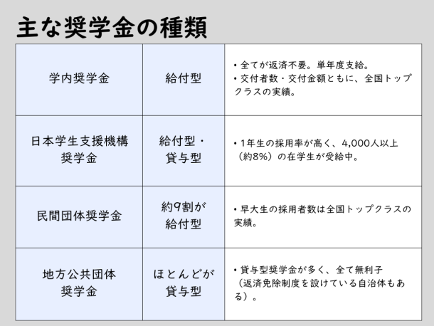 学生生活の大きな支えとなる奨学金。一方で、「返済が大変そう」「手続きが難しそう」と不安を抱く学生も少なくないのでは? 実は、早稲田大学には独自の学内奨学金が約150種類あり、その全てが返済不要の“給付型”奨学金。また、民間奨学金にも多くの給付型があり、学内奨学金との併給も可能(※)です。