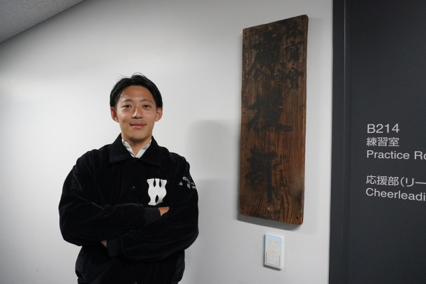 写真左:2025年の応援部スローガンは「心」。豊島さんが自ら考案したそうで、学ランにも刺しゅうを施している。振り付けや演奏の一つ一つに心を込め、選手を全力で応援するという熱意が刺しゅうの色にもにじんでいる