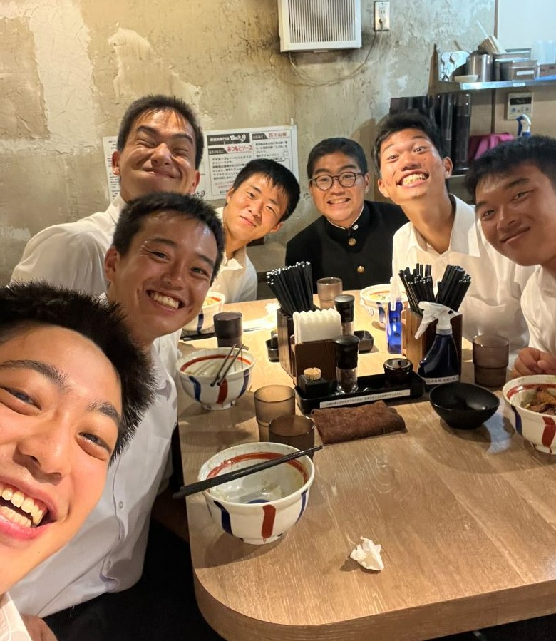 最上級生になった今、後輩を連れて食べるワセメシ。一番左端が豊島さん。応援部には「やるときはやる、休むときは一緒に休む」という切り替えの文化が根付いているという