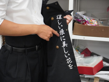 写真右:上級生になると増やせる刺しゅう。 “逞(たくま)しい根”は応援部員、“美しい花”は学生・選手たちを表しており、応援部の支柱として代々受け継がれてきた言葉だそう