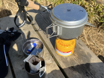 山頂での極上の時間。調理用具のコッヘルとガスバーナーは小学生からの友