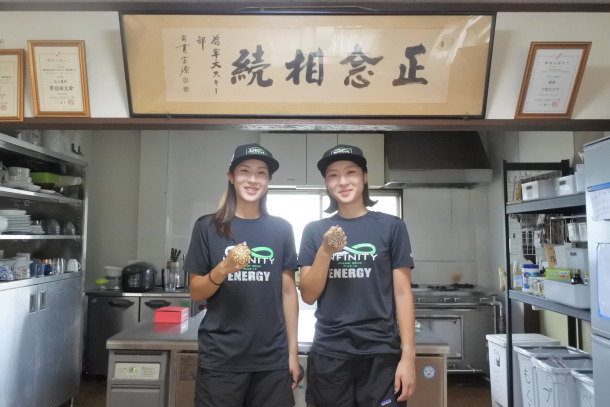 早稲田大学スキー部合宿所(埼玉県所沢市)の食堂にて。左から優奈さん、春香さん。2025年の「世界選手権」で獲得したメダルと共に