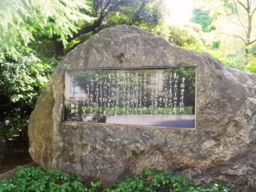 The first edition of "Harmony of Eastern and Western Civilizations" by Shigenobu Okuma (left) and a monument to the Waseda University Alma Mater next to the main gate Waseda Campus (right)
