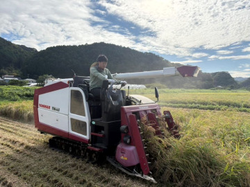 写真左:コンバインに乗って稲作の手伝いをしている様子