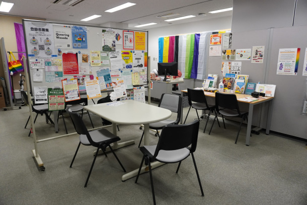 戸山キャンパス 30号館1階 学生会館にある本館のラウンジ風景。本棚にはジェンダーやセクシュアリティに関する書籍がズラリ! 早大生ならいつでも貸し出し可能
