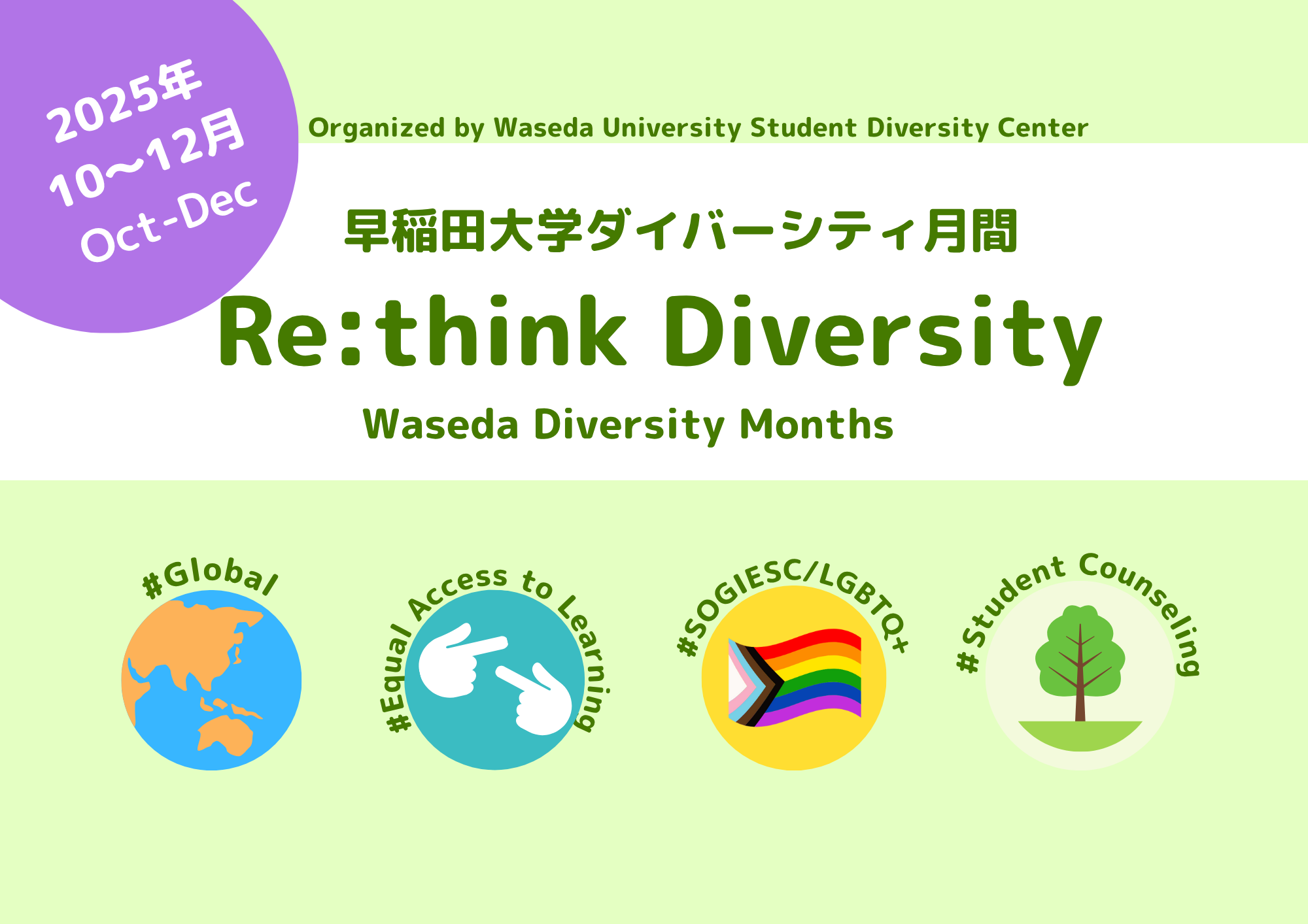 早稲田大学校歌の歌詞「東西古今の文化のうしほ」にもあるように、早稲田大学では創立以来、多様性を重んじる精神を受け継いできました。現在では、スチューデント・ダイバーシティ・センター(以下、SDC)が中心となり、国籍や性別、障がいの有無などに関わらず、誰もが平等な学びの機会を得られるよう、キャンパス全体でDEI(Diversity、Equity、Inclusion:多様性、公平性、包摂性)を推進しています。この取り組みや制度を知るきっかけとして、今回、SDCのセンター長を務める秋葉丈志教授(国際学術院)にインタビューを実施。さらに、SDCを構成するICC(異文化交流センター)、アクセシビリティ支援センター(ARC)、ジェンダー・セクシュアリティ・センター(GSセンター)、学生相談センター(SCC)の利用方法についても紹介します。早稲田に根付くダイバーシティの精神を、自分ごととして考えてみましょう。