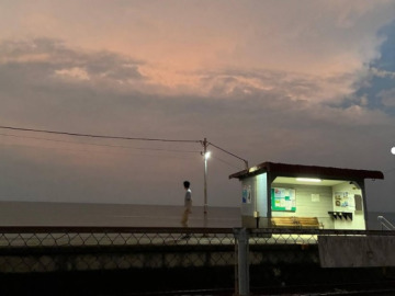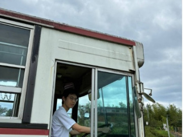 島原市を訪れた時の写真。誰もいない海沿いの駅で(左)。置いてあるバスの運転席に乗ってみました(右)
