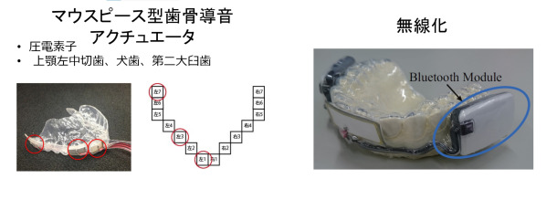 マウスピース型の歯骨伝導デバイス。左は、電気信号で圧電素子を振動させ、その振動を骨伝導により聴覚神経に伝えるデバイスで、右はBluetoothで無線化を検討したもの