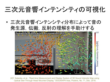 音と「AR(拡張現実)」や「MR(複合現実)」を結び付けた研究にも力を入れています。AR技術を使って、実空間に音の分布を重ねて表示すれば、どこからどんな音が出ているかを3Dで見ることができるんです。例えば、車のエンジン音など騒音とされる音波が、車体のどこからどう伝わっていくのかを特定し設計に役立てたり、建築の分野でも「静かで快適な空間」をデータとして再現したりすることが可能です。
