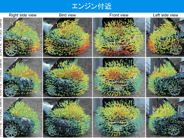 写真左:アイドリング状態にある自動車で、エンジンルームから発生する音を3Dで表現した様子