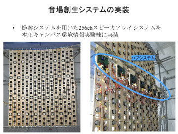 本庄キャンパス 環境情報実験棟に実装した、256個のスピーカーを組み合わせた「音場創生システム」。256個のスピーカーを独立して駆動することが可能で、高速1bit信号処理を用いることにより、シンプルなシステムとして実現した