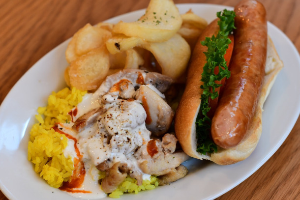 自家製ソーセージをチキンオーバーライス、ポテトフライと一緒に味わえるお得な「学生セット」