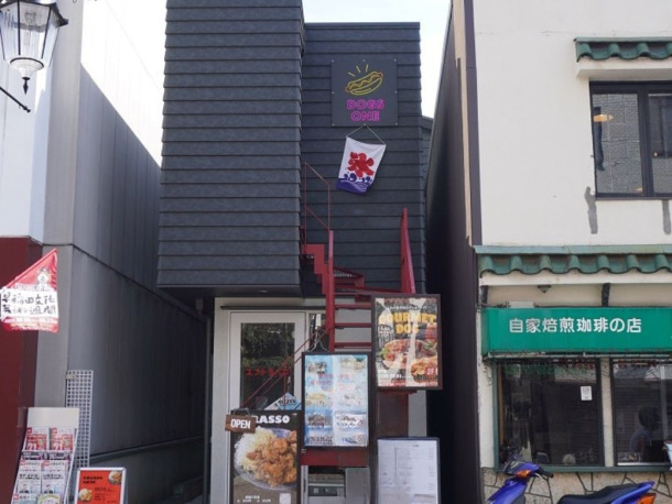 早稲田キャンパス南門を出て、早大南門通り沿いすぐ右手の建物の2階にある「DOGS ONE(ドッグスワン)」は、2025年1月にオープンしたホットドッグ専門店です。