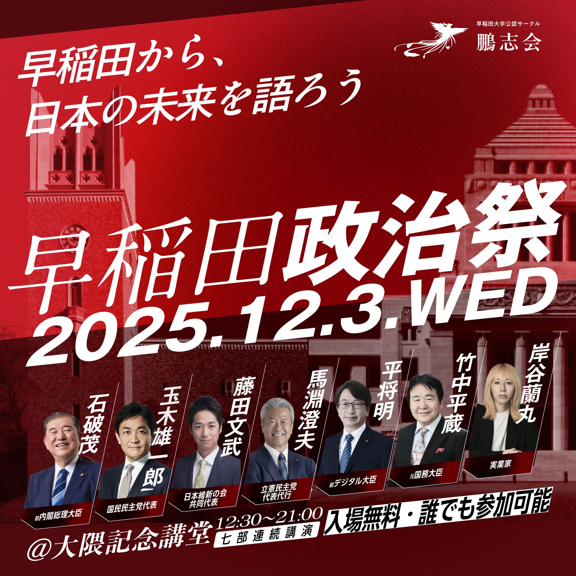 早稲田大学鵬志会では、前代未聞の七部連続講演会「早稲田政治祭2025」を開催する運びとなりました。本イベントは「未来への志」をテーマに、戦後80年を数える激動の2025年に生きる学生・若者に、政治の生の議論に触れる機会を提供することを目的としております。