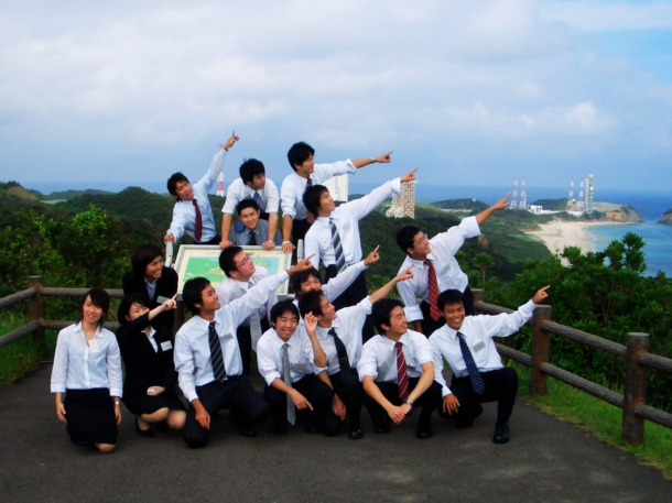 2005年10月、鹿児島県種子島宇宙センターで行われたJAXAの内定式で同期との集合写真。後列左端が菊池さん