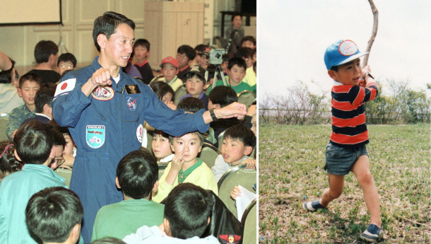 写真左:1992年10月、宇宙飛行士の毛利衛氏が帰国後に宇宙授業を行っている様子。当時、多くの子どもたちに夢を与えた
