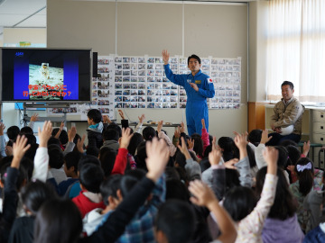 写真左:茨城県の小学校で行った「防災宇宙教室」の様子。制約ある宇宙での暮らしと避難所での暮らしの共通点に着目した授業を各地で展開した