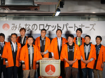 写真左:J-SPARCの活動で、民間ロケット開発企業とのパートナーシッププログラムを発表した時の一枚。右端が菊池さん