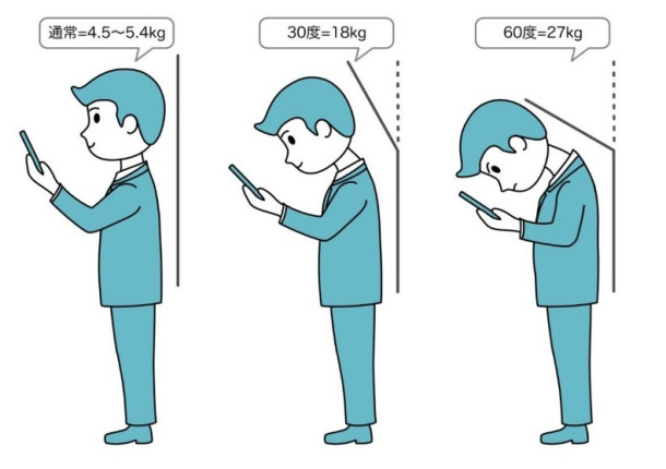 スマホ首になる主な原因は、首を前傾する姿勢を長時間続ける生活習慣です。私たちはスマートフォンを見るとき、無意識にうつむき姿勢になりますね。大人の頭の重さは約5kgですが、首の曲がる角度が大きくなるほど頚椎に掛かる負担は増え、30度で約18kg、60度で約27kgの負担が掛かるといわれています。