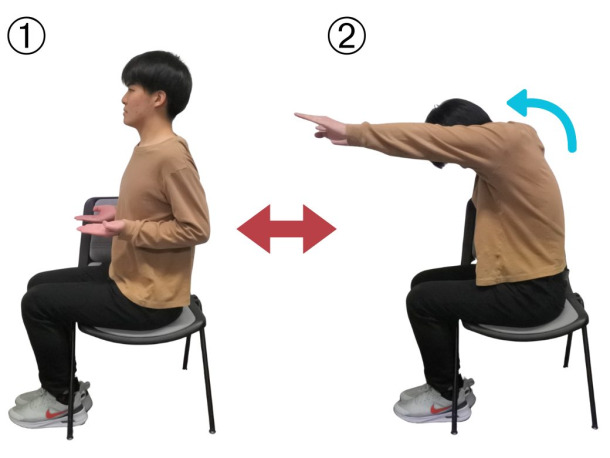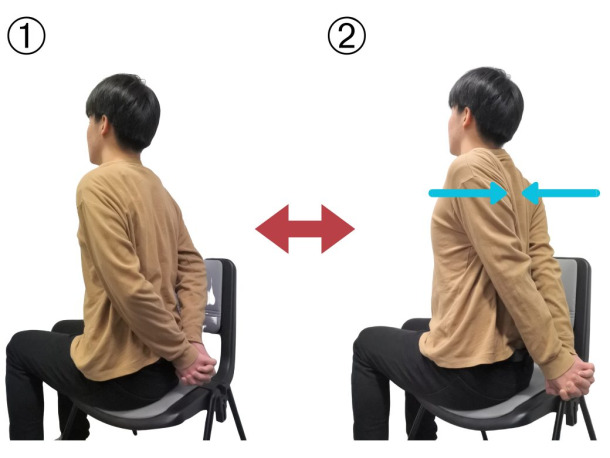 ➀ 椅子に座り、手のひらを上にしてひじを曲げて胸を張る