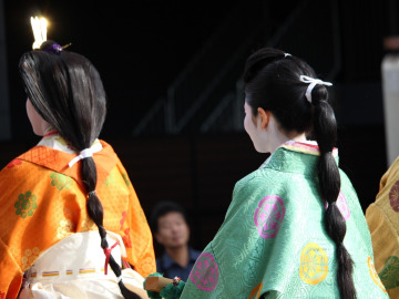 この日はあいにくの小雨にもかかわらず、沿道は観客であふれかえっていました。これまでは台車に乗っての参加だったため、今回御所から平安神宮まで約5キロの道のりを慣れない草履で無事歩けるか少し心配でしたが、実際に行列が始まると高揚感も相まって、あっという間の2時間半でした。