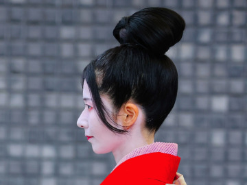 江戸婦人列はかつらを使用せず、この日のために長く伸ばした自分の髪を結ってもらい参列します(写真提供:John Norris)
