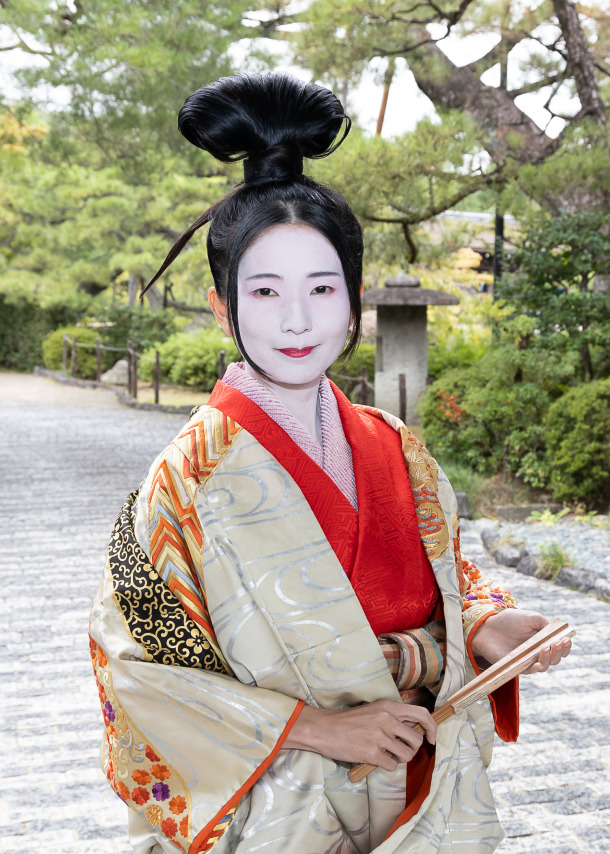 時代祭が始まって130年目の節目の2025年、江戸時代の名妓(※1)吉野太夫(よしの・だゆう)として行列に参加する機会に恵まれました。京都市地域女性連合会の役員を務める母が結んでくれた縁で、時代祭に江戸婦人列の一員として出るのは3回目でしたが、これまでは皇女和宮(かずのみや)の女嬬(※2)役での参加だったため、新しい役柄に心躍りました。