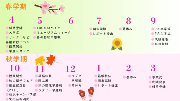 早稲田大学の一年間の主な予定を紹介します。学園祭などの大きなイベントは『早稲田ウィークリー』の各コーナーでも取り上げるので、お楽しみに!