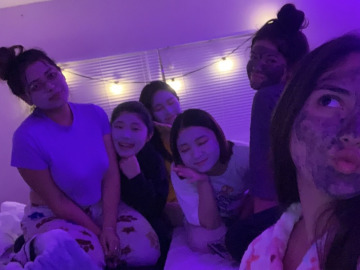 写真左:高校1年生の米国留学時、寮でフェースマスクパーティーをした時の一枚(左から3人目が高橋さん)。さまざまな国籍の学生がいた寮生活では、文化の違いを学べたことも大きな経験だったそう