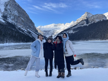 写真右:大学2年生のカナダ留学で、韓国人の友人たちとロッキー山脈の観光地・バンフへ旅行した様子(左から2人目が高橋さん)