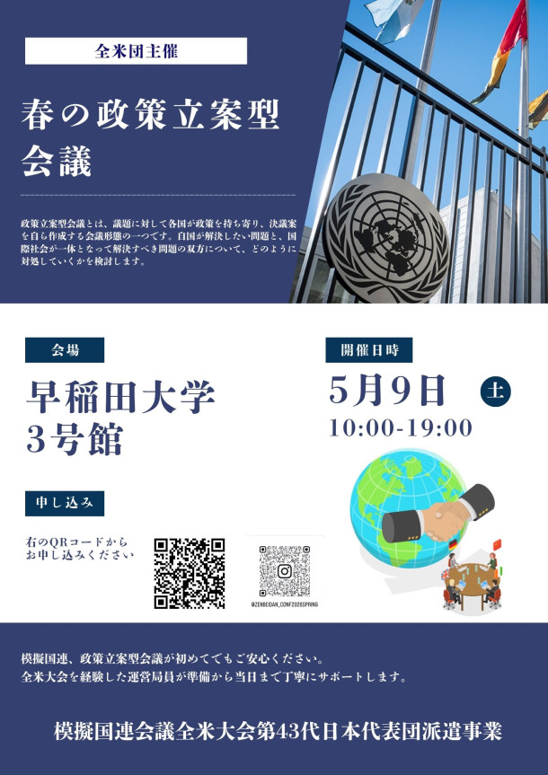 模擬国連では、各国の代表として国際問題について議論し、合意形成や政策提案を行います。今会議は、ニューヨークで開催される模擬国連会議全米大会の会議形式をお気軽に体験できる絶好の機会です。
