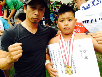 写真右:小学生の頃、大会で優勝して父と撮った写真