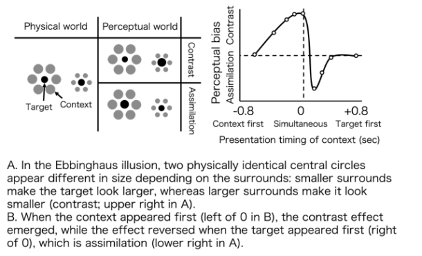 To investigate this, I conducted experiments using the Ebbinghaus illusion, a classic size illusion. In this illusion, a central circle (the target) appears smaller when it is surrounded by larger circles, and larger when surrounded by smaller circles (the inducers or contextual stimuli; left side of the figure). In my experiments, I systematically manipulated the relative timing of the target and the contextual circles to examine the temporal dynamics of the contextual effect. I found that when the context precedes the target, the typical illusion occurs. However, when the context is presented after the target, the effect reverses: targets surrounded by small circles appear larger, and those surrounded by large circles appear smaller (right side of the figure).
