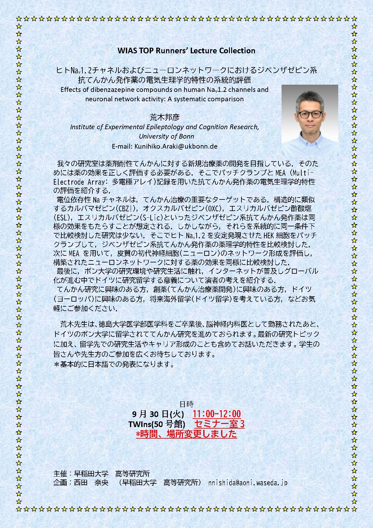 Top runners’ lecture collections: ヒトNav1.2チャネルおよびニューロンネットワークにおけるジベンザゼピン系抗てんかん発作薬の電気生理学的特性の系統的評価(9/30)