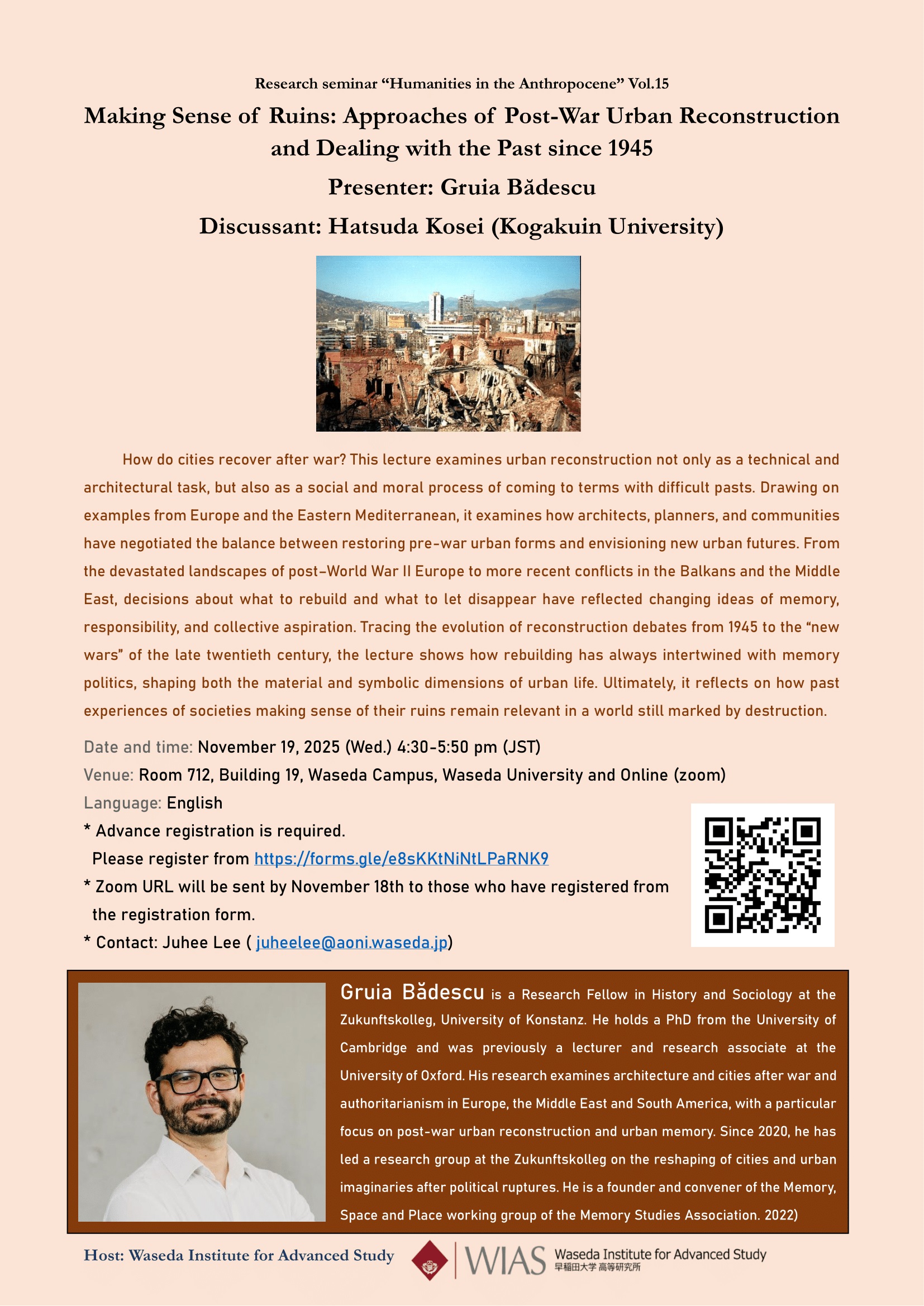 高等研究所「人新世と人文学」セミナーシリーズ(第15回) “Making Sense of Ruins: Approaches of Post-War Urban Reconstruction and Dealing with the Past since 1945″(11/19)