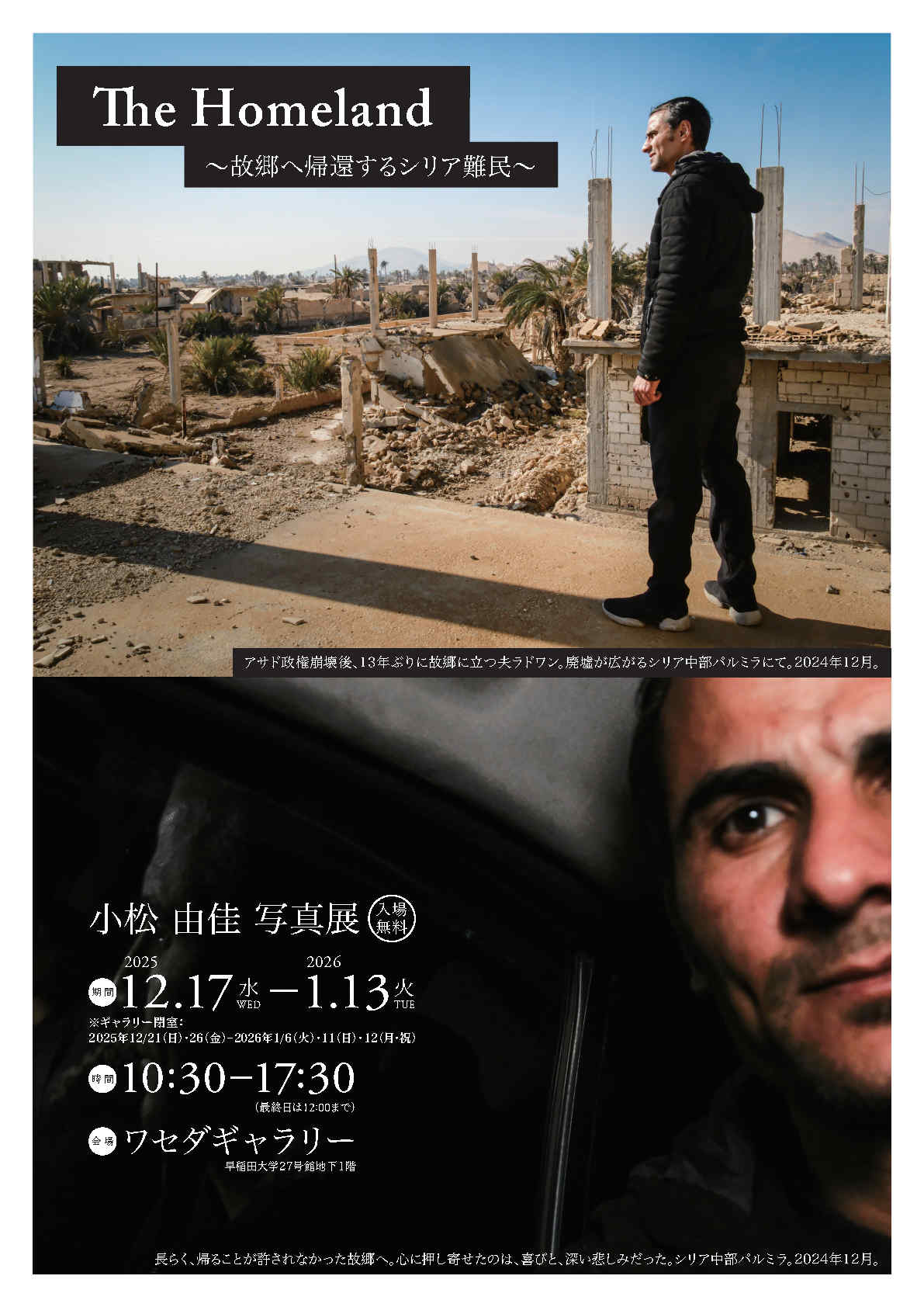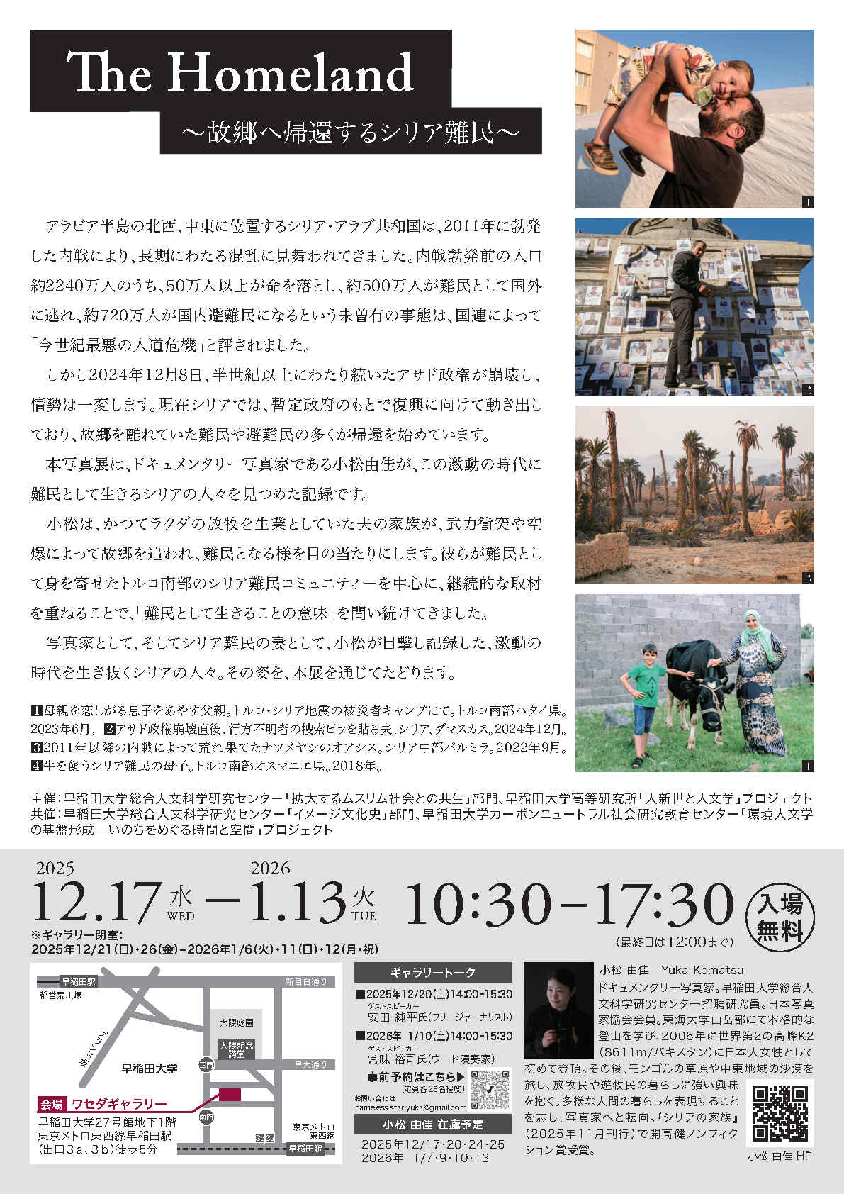 【展示内容】フォトジャーナリストである小松由佳氏(早稲田大学総合人文科学研究センター・拡大するムスリム社会との共生部門の招聘研究員)が実施したシリア取材、シリア難民取材に基づく写真展。2024年12月のアサド政権崩壊から1年の節目、また2025年7月には小松氏が『シリアの家族』(集英社より2025年11月近刊)にて第23回開高健ノンフィクション賞を受賞し、11月には受賞作が発刊となることを期して企画した展示内容である。これまでの取材写真を通じて、砂漠の生活や文化とシリア難民の現在を伝え、シリアの未来を考える契機としたい。